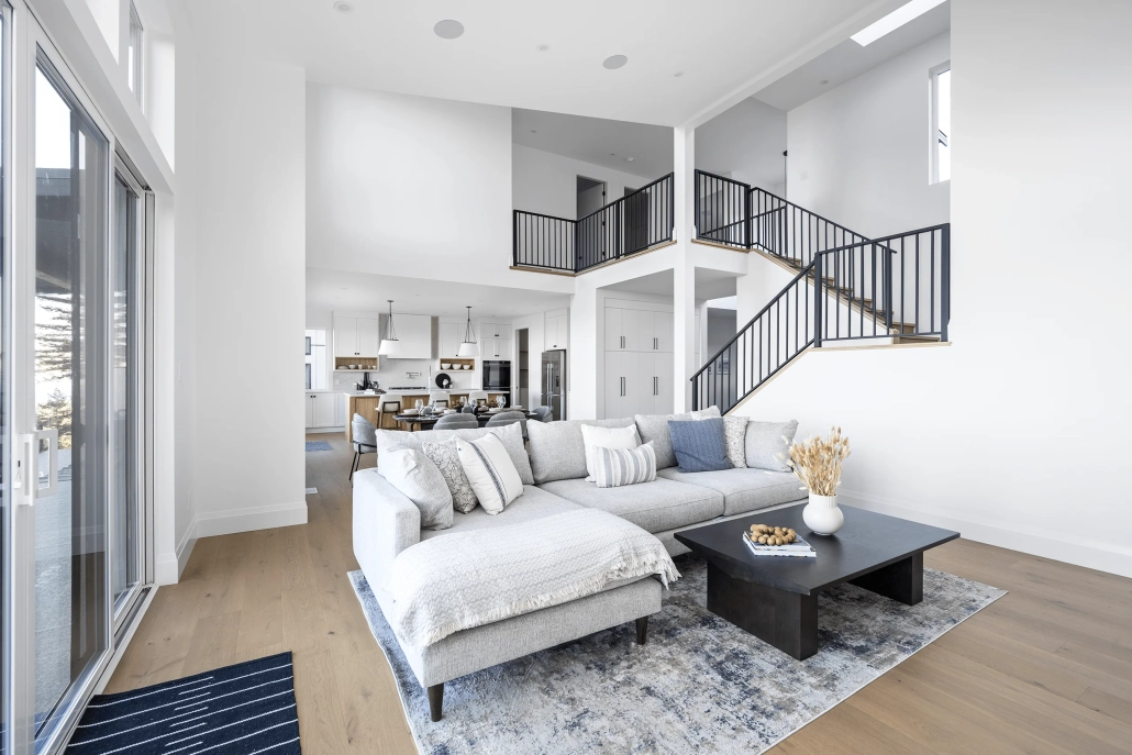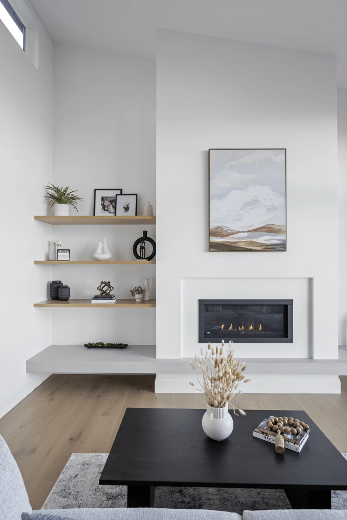 The living room features a two-story vaulted ceiling that amplifies the sense of space and openness. A contemporary fireplace with a two-tone plaster detail serves as a striking focal point, complemented by floating white oak shelves that add both form and function. The design captures the essence of modern elegance, blending sophisticated materials with a relaxed, airy atmosphere.