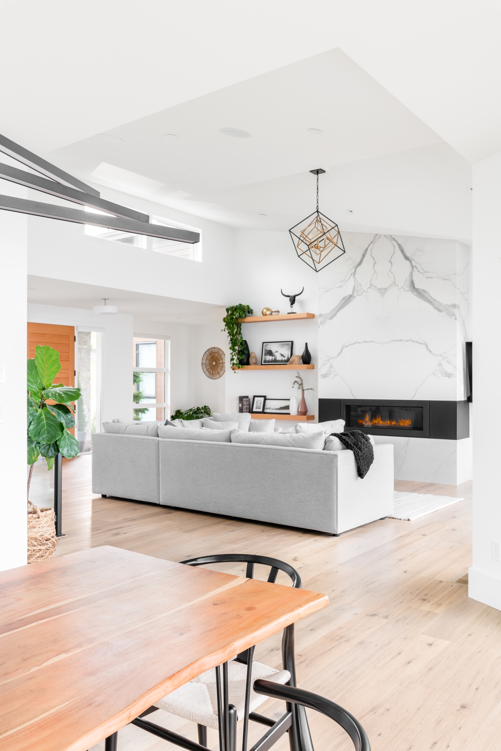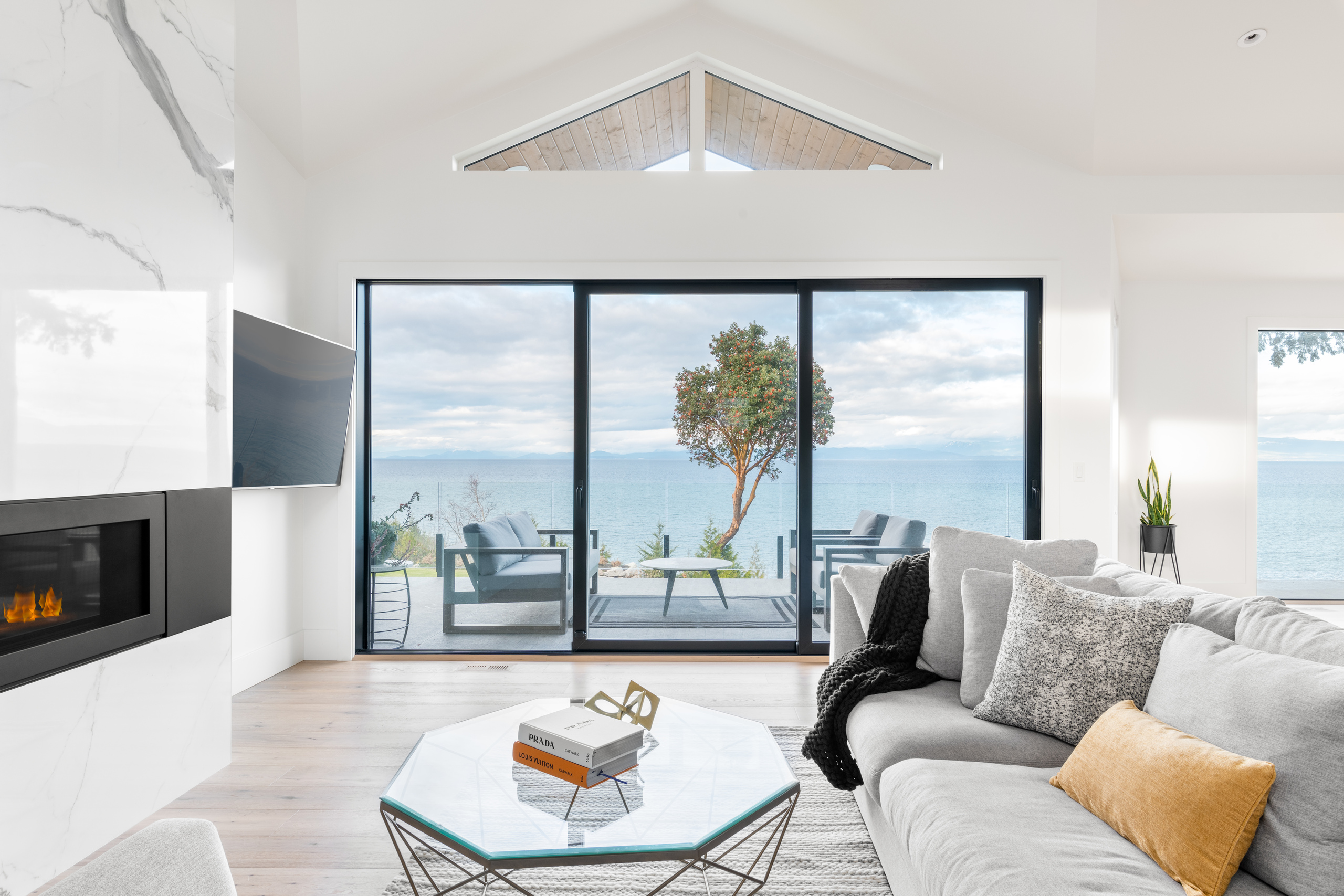 This oceanfront oasis focuses on simplicity and unique, thoughtful details throughout the home to create a warm, welcoming environment. Natural light pours into this space from the large windows overlooking the ocean, and a neutral colour palette with tasteful wooden accents keeps the home bright and fresh. The dramatic linear modern fireplace in the center of the home creates a stunning focal point; the two large porcelain slabs were carefully installed to create this one of a kind piece.